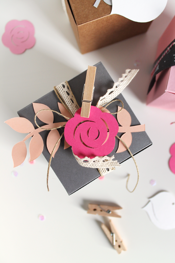 Scatola grigia: un nastro in pizzo (differente da quello usato per la scatola craft), un fiocco con un cordino sottile di canapa, un ramo di foglie color salmone ed una rosellina di carta semplicemente tenuta con una mollettina di legno.