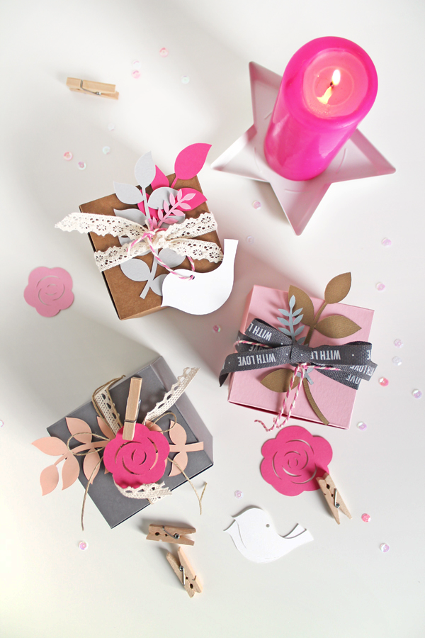 Scatola rosa: una scatola è bella anche solo con un fiocco... Se poi il fiocco è fatto con un elegante nastro grigio con scritto "with love"... E' perfetto! Ho aggiunto un tocco craft per scaldare questa combinazioni di toni freddi, e ancora del baker's twine: per me il pacchetto deve essere semplice e "ricco" nello stesso tempo! :)